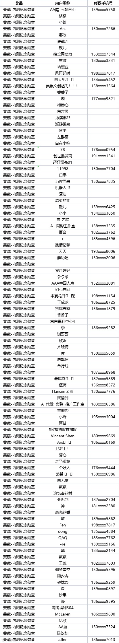 一等奖:斐藏-内测纪念勋章中奖榜单
