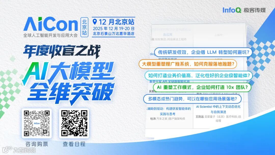 12 月 19~20 日,AICon 2025 年度收官站 · 北京见。两天时间,聊最热的 Agent、上下文工程、AI 产品创新等等话题,与头部企业与创新团队的专家深度交流落地经验与思考。2025 年最后一场,不容错过。