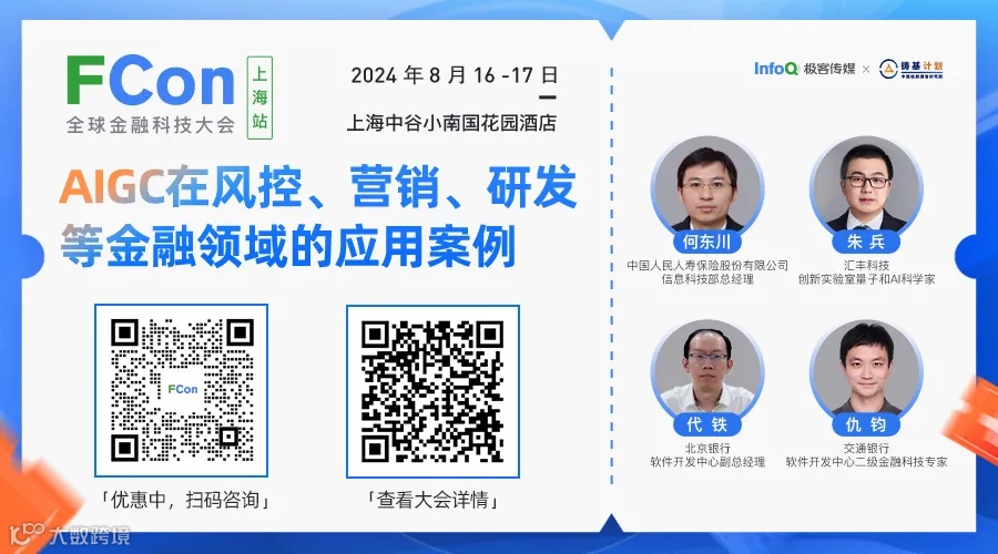 8 月 16-17 日,FCon 全球金融科技大会将在上海举办。本届大会由中国信通院铸基计划作为官方合作机构,致力于展示金融数字化在“十四五”期间的关键进展,以及近一年多来金融领域的 AI 大模型落地实践。大会邀请了来自工商银行、交通银行、华夏银行、北京银行、广发银行、中信银行、平安证券、华泰证券、度小满、蚂蚁集团等金融机构及金融科技公司的资深专家,现身说法分享其在金融科技应用实践中的经验与深入洞察。大会火热报名中,详情可联系票务经理 17310043226 咨询。