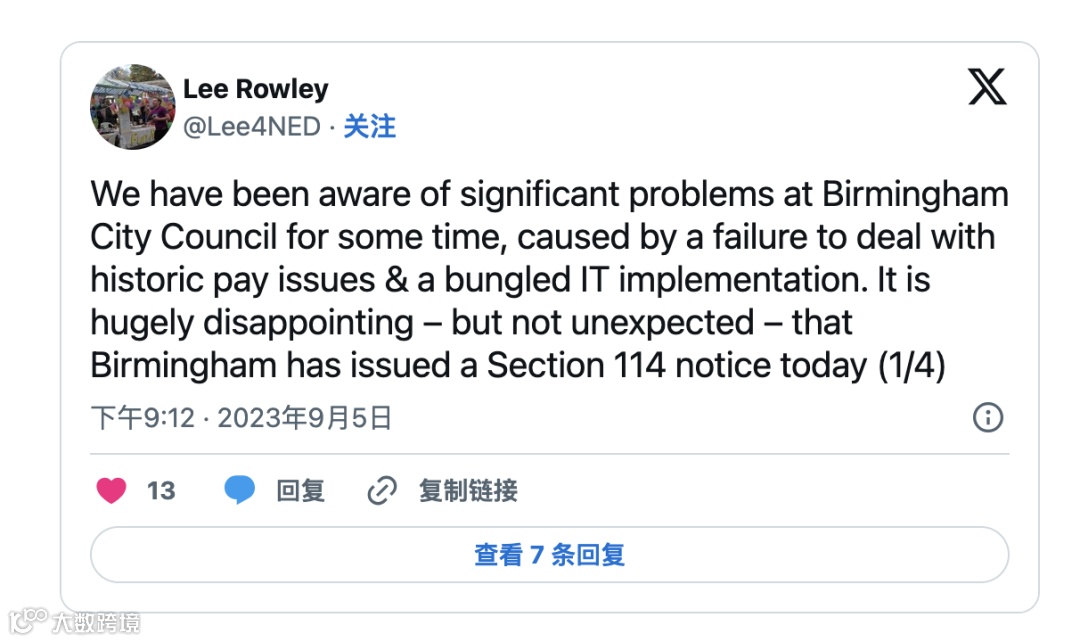 伯明翰地方政府部长李·罗利 (Lee Rowley) 在一系列推文中表示:“我们早就意识到伯明翰市议会存在严重问题,原因是未能处理历史薪酬问题和 IT 实施不力。