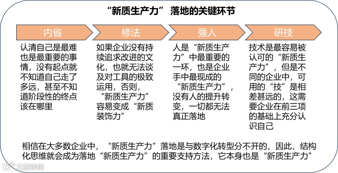 综上,“新质生产力”的落地,跟对它的权威解释中提到一个词关系非常密切,也就是“创新”。“创新”并不是灵机一动、灵光乍现,企业追求的是持续创新能力,这就需要首先从“内省”做起,能够客观地分析自己;其次是“修法”,有对优化、改良的持续追求,只有这种追求才能产生持续的创新意愿,否则,一旦自满,创新也就停止了;再次是“强人”,“新质生产力”不是替代人的,人本身就是“新质生产力”,所以必须持续强化人的能力,而人的能力中最有价值的是思维,这是人之所以为人的根本,结构化思维是这个时代的特征,必须培养;最后才是“研技”,没有以上条件“技”无法发挥应有的作用,而“技”在不同的企业可“研”的差别也很大,所以,“技”要企业自己把握该干什么,这也是为什么需要前三项作为条件的原因。“新质生产力”的落地在很多企业中与其数字化转型也是密不可分的,要充分地结合在一起去思考。