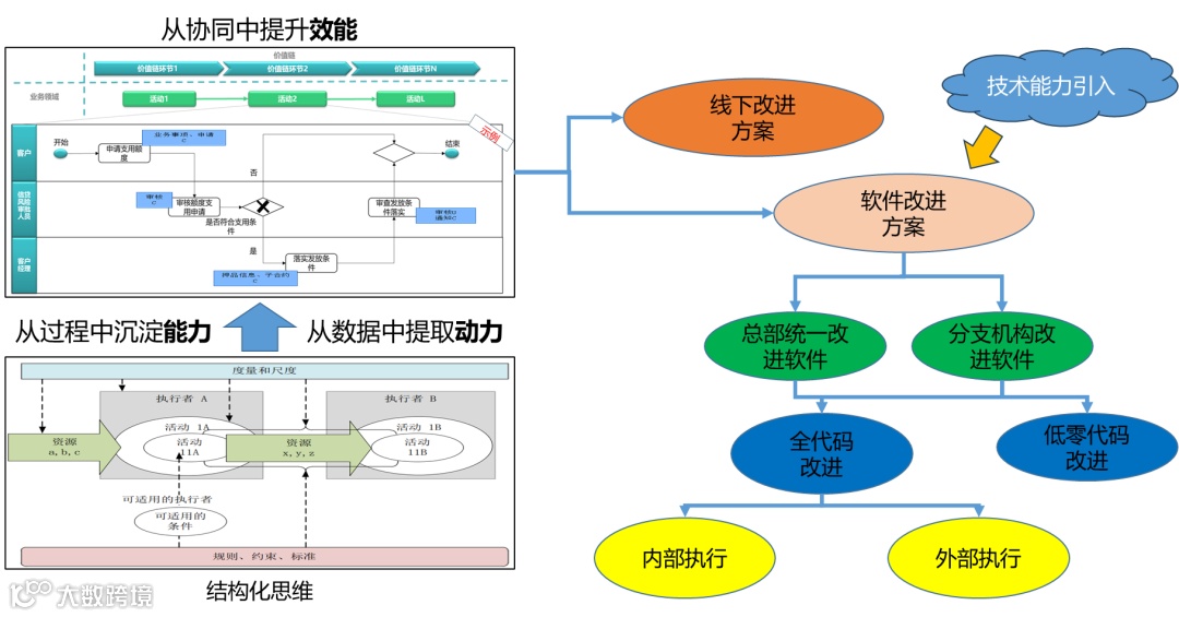 这里的“强人”指的是强化人,强化人的能力,尤其是业务侧人员。企业层面可以用的“新质生产力”很多会转化成软件和数据能力来展现给业务侧,也就是业务侧人员要想全面理解“新质生产力”,提高“新质生产力”学习能力,不见得是直接去学一些新技术,这样未必有很直接的效果,或者效果比较浅,只局限在一些软件或技术工具的基本能力上,很难再做更多的创新。还是需要业务侧人员先学会定义问题、分析问题、解决问题,学会形成业务解决办法的基本能力。由于数字时代很多工作、产品、服务都与数字化有联系,因此分析解决办法和表达解决方法就都需要一定结构化能力,就像上文分析过的,凡于数字化相关的,大体离不开软件和数据,而他们都是结构化的,要想将业务解决办法变成数字化方案,就需要结构化地表达需求,那不如从一开始分析问题就采用结构化方法,这样分析和表达就是一体的,连续承接下来的。