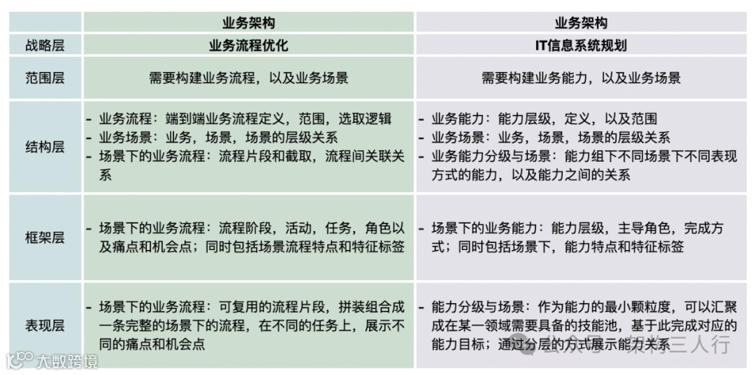 范围层:业务架构中包含了业务流程架构和能力架构,同时当我们的目标是组织优化的时候,还需要包含我们的组织架构以及它们之间的关联关系。 -