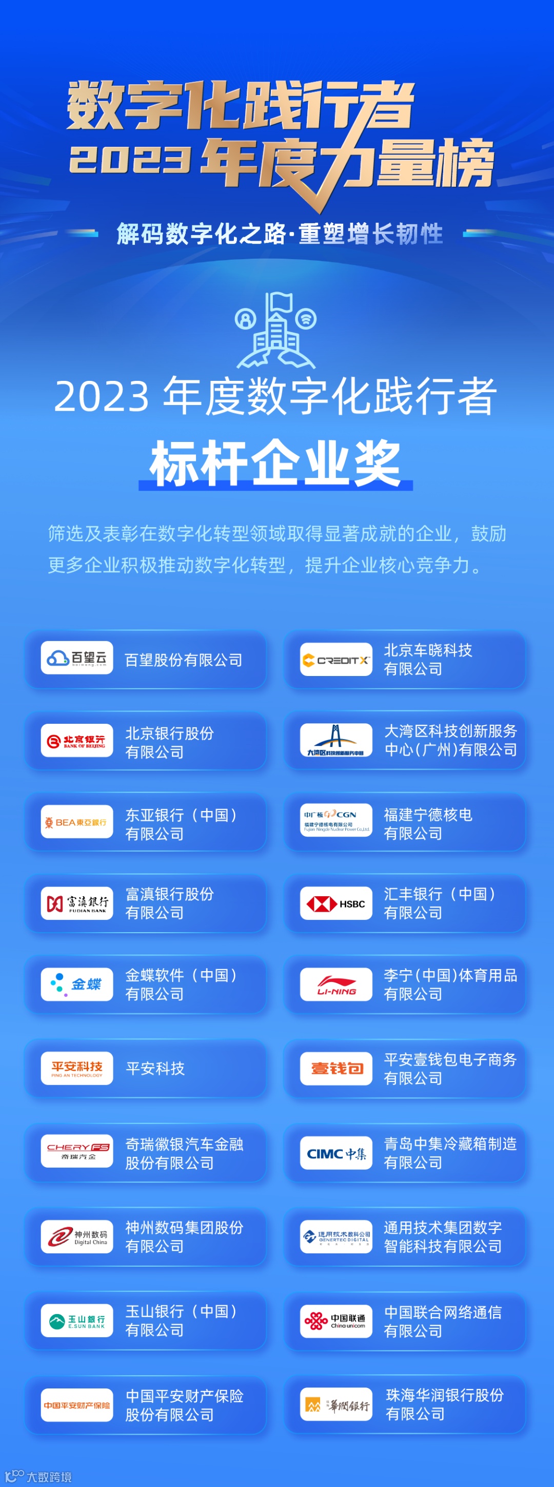 「2023 年度数字化践行者标杆企业奖」旨在筛选及表彰在数字化转型领域取得显著成就的企业,鼓励更多企业积极推动数字化转型,提升企业核心竞争力。最终 20 家企业入榜,覆盖金融、能源、制造、通信等行业,获奖企业均在数字化转型战略及路径制定、数字化转型落地成果、数字技术创新与应用、数字化组织变革、企业文化及人才发展、社会责任与贡献等方面拥有清晰部署并取得了可观进展。
