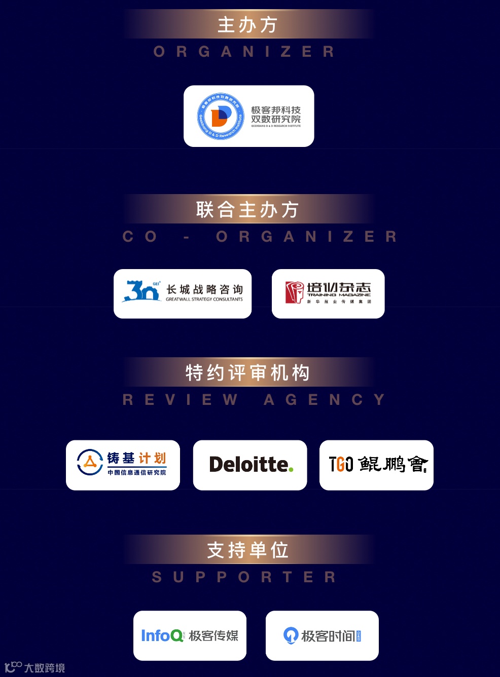 秉承公平公正的评选原则,本次榜单由极客邦科技双数研究院联合长城战略咨询、培训杂志共同发起,特邀中国信通院“铸基计划”、德勤中国、TGO 鲲鹏会作为联合评审机构,评选严格把控流程、建立统一标准,经组委会初审和 6 家联合评审机构的 10 多位专家终审层层甄选。