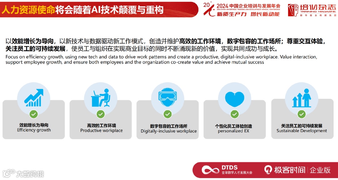 人力资源的使命会不会发生变化?我们提了几个关键词,前两个是“效能增长为导向”和“高效的工作环境”,这是传统人力资源的核心,不赘述。后面三个关键词是区别,是差异化的。