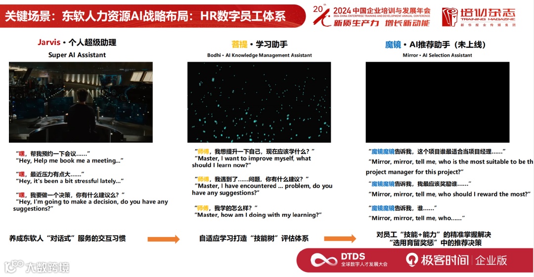 强调完关键人才,我们讲关键场景。我们大家在找关键场景时,一定要有对现有应用的批判性创新思维才可以。并不是说这个东西拿过来用它就有价值,或者说大部分人这么用它就有价值。我们也找了一些关键的场景,列举了 HR 的数字员工体系。这个体系的第一个部分叫 Jarvis,是 AI 打造的个人超级助理,它可以收集到更多员工数据,让我们更加了解员工。第二个叫菩提,是员工的学习助手。最后一个叫魔镜,是一个 AI 推荐助手,可以给我们推荐谁适合什么岗位,谁最适合晋升,给我们提供全面的建议和指导。