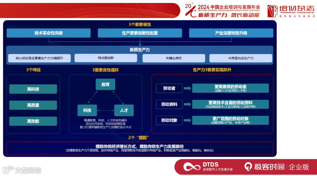 现在我们再来看“新质生产力”这个词。这里有生产力三要素:劳动者、劳动资料和劳动对象,它们会往更高素质、更高技术含量和更广范围这三个方向变革。