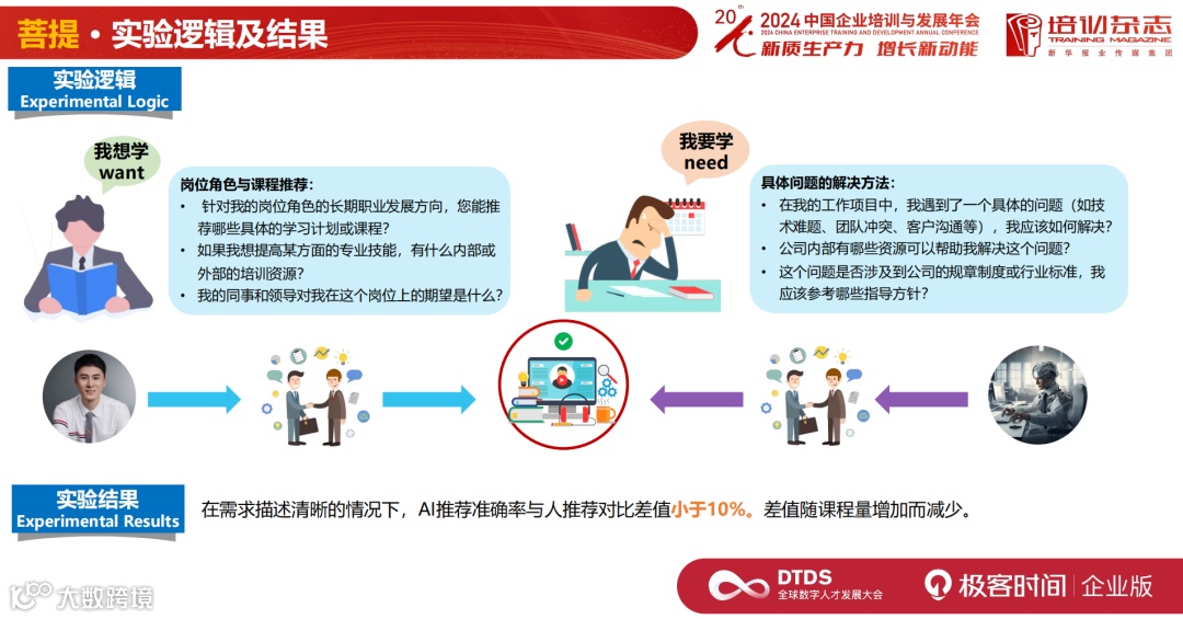 我们对菩提做了实验,发现在需求描述清晰的情况下,在推课的场景里, AI 推荐的准确率和人推荐的准确率对比差值小于 10%。