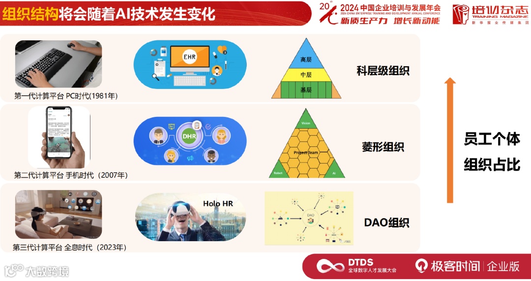 第三个计算平台,我认为标志是去年 Vision Pro 的发布,元宇宙、虚拟现实很有可能会给我们的组织带来 DAO (去中心化组织)的变化。我们能发现的趋势就是员工的个体占比越来越强,组织的框架管理越来越弱。从科层到菱形,你会发现超级员工在组织里更容易凸显出来。