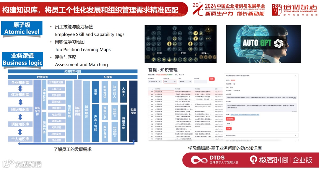 你会发现在 AI 时代下这件事情做得很简单,以前需要很多专家研究很久,花费大量成本来出题定级,现在用具备世界知识的大模型可以迅速给出方案。所以这件事情变得成本很低,企业基于培训来做决策也更加清晰和简单了。以前可能也有老板拍脑袋做决策,比如他要 All in AI,因为他有前瞻性思维,但是对现状没有清晰的认知。如果你的技能树告诉他,我们的 AI 技能的人才储备度是红色的,不是绿色的,那他不会做这个决定。他一定会先把红色技能周围的技能点标出来,把这些人送过去培训 AI,学完之后把这个灯变绿色,再做 All in AI 的战略决策。所以这其实对管理者来讲是更好的抓手。