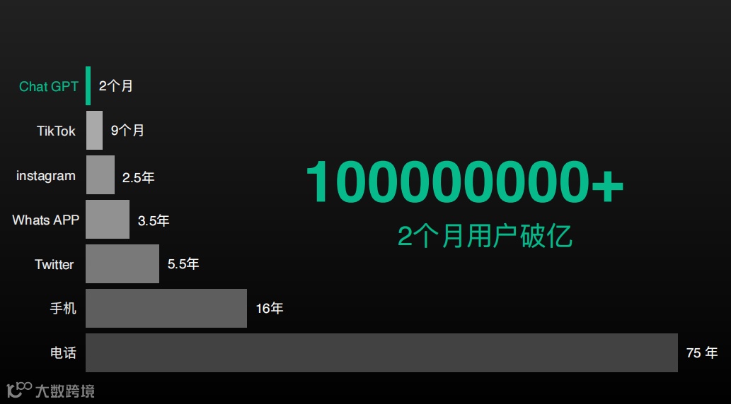 首先,大模型大家肯定都是知道的,自从 ChatGPT 这款应用产品发布之后,仅用了两个月时间,全球用户数就突破一亿了,这比我们人类历史上所有的流行产品速度都要快很多。2 个月破亿这个记录有多惊人,我给大家看一组数据。