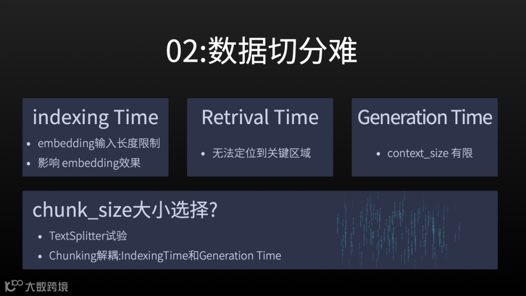 然后就是数据切分难的问题。当我们提供数据给大模型后,大模型怎样进行切分,怎样确定向量,这些都是我们不可控的。对于这些问题,通常有五种技术解决方式。