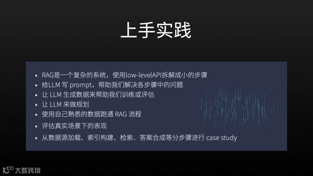 最后就是反馈、评估和迭代。这就是字面上的意思,在发布了产品之后,怎么知道它的表现好不好?就需要收集反馈的数据,比方说,回答的质量如何,检索质量是否达标,引用是否完整等在前期的每个环节。如果想检查其中某个环节,就应该在那个环节做好数据的召回、采集和埋点等工作。