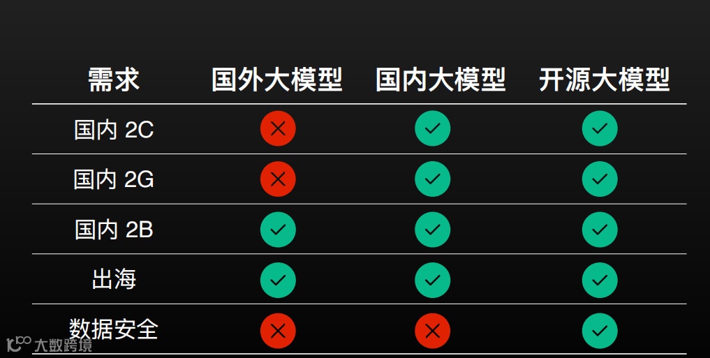 无论哪个行业,只要是面向用户的,他就必须符合监管要求,涉及到国家的法律道德、涉及到意识形态、那这个在合规性方面要求是非常高的。在用大模型的时候,我们担心的可能是大模型无法回答问题或给出错误答案。但更害怕大模型随意回答,尤其是在涉及国家、民族和相关的重要历史问题时,必须确保大模型不会在这些问题上“一本正经地胡说八道”,这造成的后果是很严重的,所以选择一个靠谱的大模型是非常重要的。目前国内报备审批通过的大模型效果都是很好的。这张表是面向 C 端用户、面向政府、面向商用、出海的一些要求,如果本身对数据安全的要求特别高,那么只能选择开源大模型来保证数据隐私。