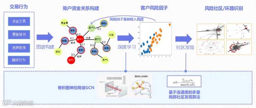 图谱查询推理是基于构建好的知识图谱,通过查询语言(如 Gremlin)可以查询特定实体的属性、关系以及实体间的关联信息。利用丰富的图算法实现知识推理与知识挖掘,包含基础图分析算法如社区发现、标签传播、PageRank、环路识别等,以及图神经网络算法如 GCN(图卷积神经网络)、GAT(图注意力网络)等;基于图神经网络的强大模式识别能力,分析借款人的社交网络、交易网络、信用网络等,有效识别潜在欺诈团伙或高风险客群;同时分析客户的消费行为、偏好或需求,挖掘潜在价值客户,提供个性化的产品服务。