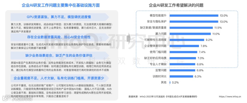 但生成式 AI 开发者们在实际操作中也遇到了不少挑战。有将近六成的开发者表示,如果企业能提供一套完整的应用开发工具链,他们的工作就能更加得心应手。另外,由于 AI 技术的应用还处于初期阶段,生成式 AI 开发者们对于实践指导和专业技术上的咨询需求也很旺盛。毕竟,站在技术的前沿,谁不想有个靠谱的向导呢?
