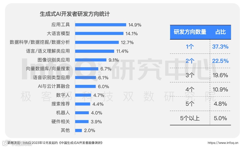 AI 开发者们在多个领域展开激烈的技术角逐。超过 60% 的开发者涉猎超过两个研发方向,从 AIGC 到大语言模型,从数据科学到图像识别,他们的足迹遍布 AI 的各个角落。企业对这些多面手的需求,也推动了 AI 技术的快速发展。