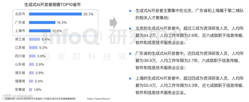 北上广深,这四个名字在生成式 AI 开发者的薪资地图上熠熠生辉。北京,作为 AI 人才的磁石,吸引了众多技术精英。而上海,以人均年薪 50.4 万元的亮眼成绩,成为 AI 开发者的薪资高地。广东和深圳紧随其后,共同构筑起 AI 人才的高薪阵地。