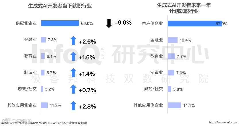 就业领域的版图将会有所变动:随着 AI 应用的不断扩散,预计在未来一年里,专注于供应侧的中小企业中的生成式 AI 开发者比例将会减少 9.0%,而这些开发者将会流向应用侧的企业,寻找更广阔的舞台。