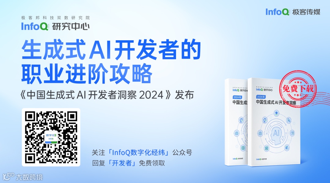 跳进 AI 的奇妙世界,一起探索未来工作的新风貌!想要深入了解 AI 如何成为产业创新的新引擎?好奇哪些城市正成为 AI 人才的新磁场?《中国生成式 AI 开发者洞察 2024》由 InfoQ 研究中心精心打造,为你深度解锁生成式 AI 领域的最新开发者动态。无论您是资深研发者,还是对生成式 AI 充满好奇的新手,这份报告都是不可错过的知识宝典。扫码关注「InfoQ数字化经纬」公众号,回复「开发者」免费领取。