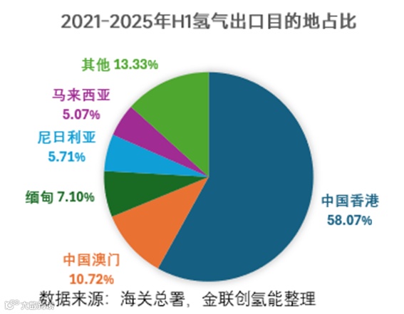 从出口目的地看,2025上半年,我国氢气共出口到全球21个国家和地区,中国香港、中国澳门、缅甸、尼日利亚、马来西亚是前五大目的地,分别为4578kg、854kg、560kg、450kg、400kg,占出口量的86.67%。