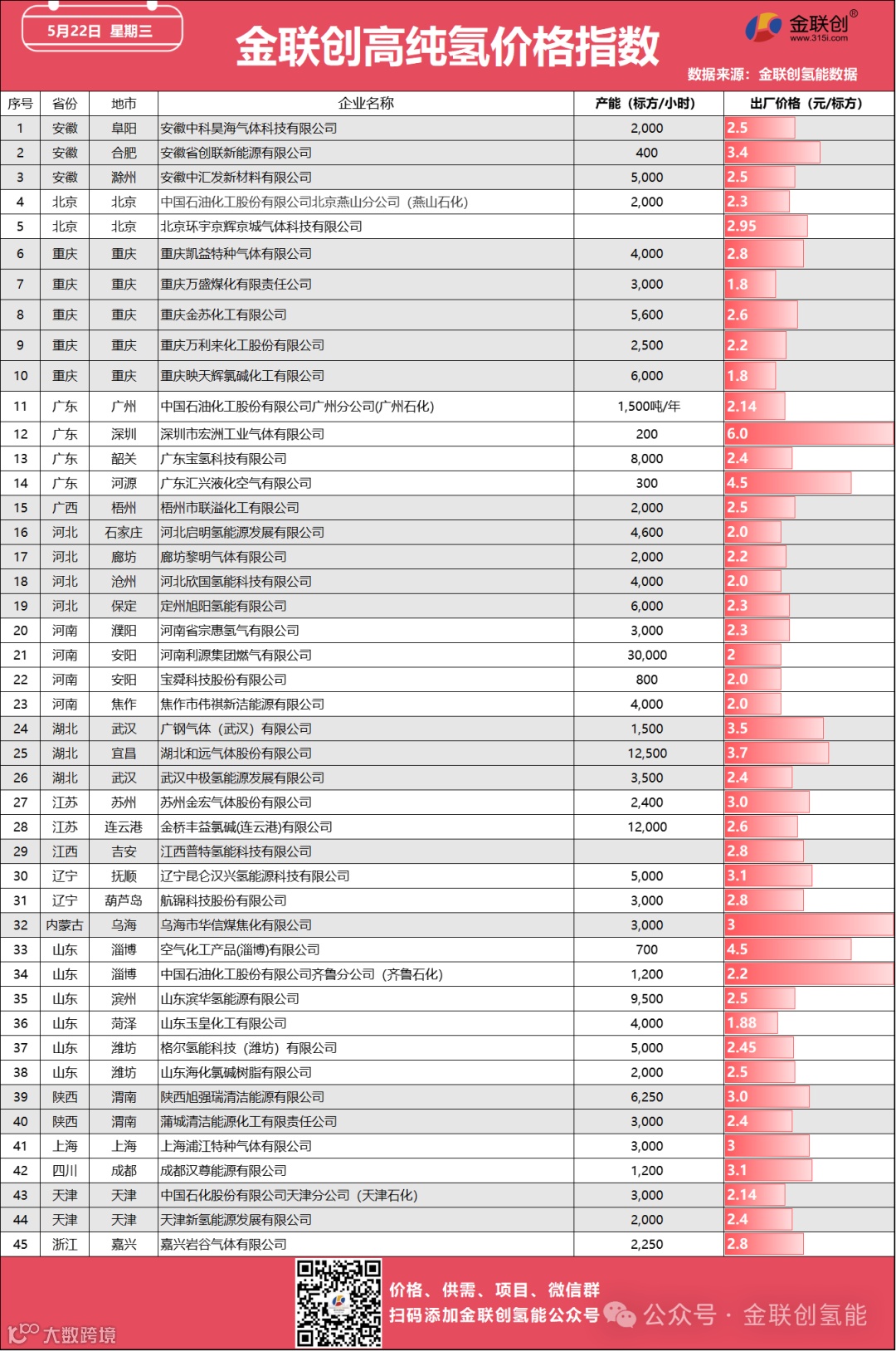金联创氢能数据库显示,2024年5月22日,全国高纯氢出厂均价2.7元/标方。