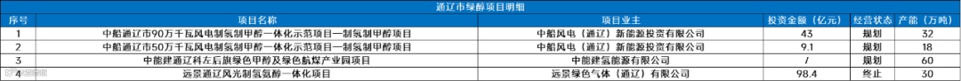 据金联创氢能数据库统计,截至2025年4月,赤峰市涉及制绿醇项目13个,总投资494.119亿元,共制绿醇产能404.26万吨/年;通辽市涉及制绿醇项目4个(其中一个已终止),总投资52.1亿元,共制绿醇产能110万吨/年;兴安盟涉及制绿醇项目8个,总投资651.575亿元,共制绿醇产能315万吨/年。