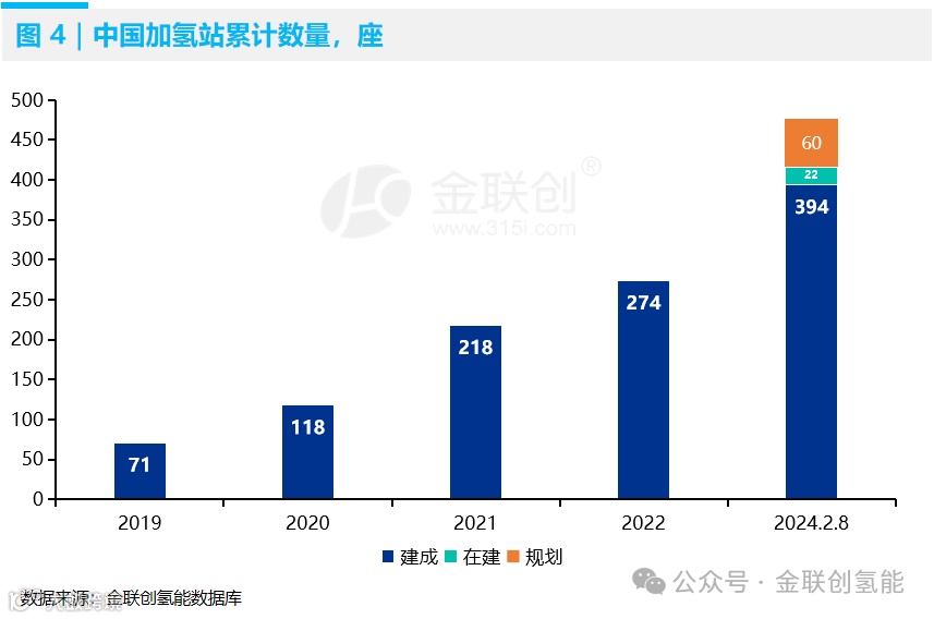 截至2024年2月8日,中国加氢站累计建成394座(不包括企业内部自用站),在建22座,规划60座。