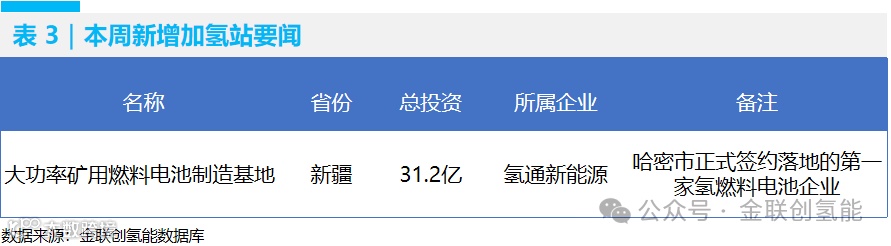 本周暂无新增加氢站投运。氢通新能源项目总投资31.2亿元,占地面100亩,涉及产能5000台/年氢燃料电池系统生产工厂、500MW风力发电、制氢工厂、加氢站等板块。
