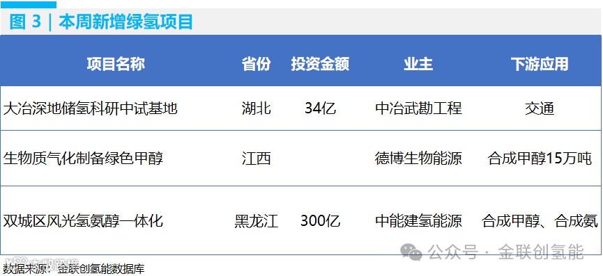本周新增2个前期、1个开工项目。其中中能建氢能源作为央企中唯一布局氢能全产业链且注册资本最大的平台公司,投资300亿元,在双城区建设风光氢氨醇一体化项目,以生产绿氨、绿色甲醇等为核心,业务覆盖制、储、运、加、研氢能产业链各个环节。