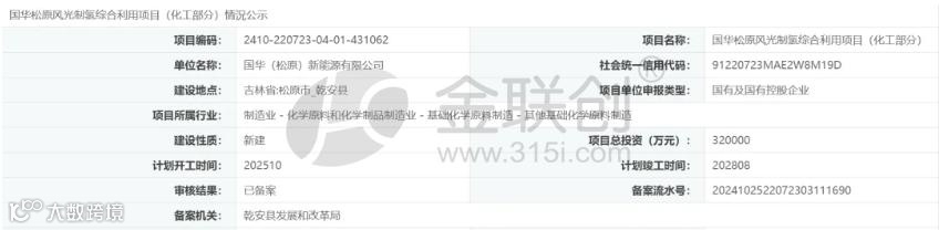 10月23日,国华松原风光制氢综合利用项目(化工部分)获备案。此项目为国华投资第二个绿氨项目,该项目投资32亿,规划建设年产30万吨合成氨工厂及相关配套设施,计划2025年10月开工,2024年6月,国华投资吉林公司国华松原风光制氢综合利用项目新能源部分完成规划选址综合论证报告编制及用地预审与选址意见书。