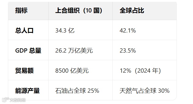 截至 2025 年,该组织已发展为覆盖亚欧非三大洲的重要国际合作平台,拥有10 个正式成员国(包括 2023 年加入的伊朗和 2024 年加入的白俄罗斯)、2 个观察员国和 14 个对话伙伴国,总人口近 36 亿(占全球一半),GDP 总量超过 23 万亿美元(占全球四分之一)。