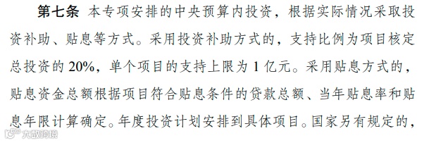 6、采用投资补助方式的,支持比例为项目核定总投资的 20%,单个项目的支持上限为1 亿元。