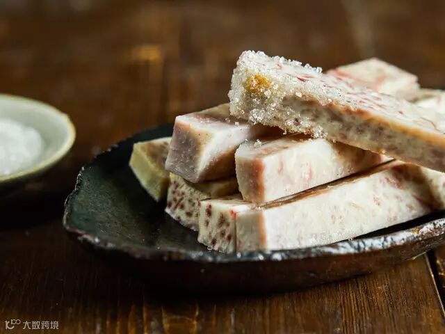 切开之后,肉质白嫩,有细密的紫红色纹理,类似槟榔花纹。纹理越密,肉质越粉,这是其他芋头所不具备的。