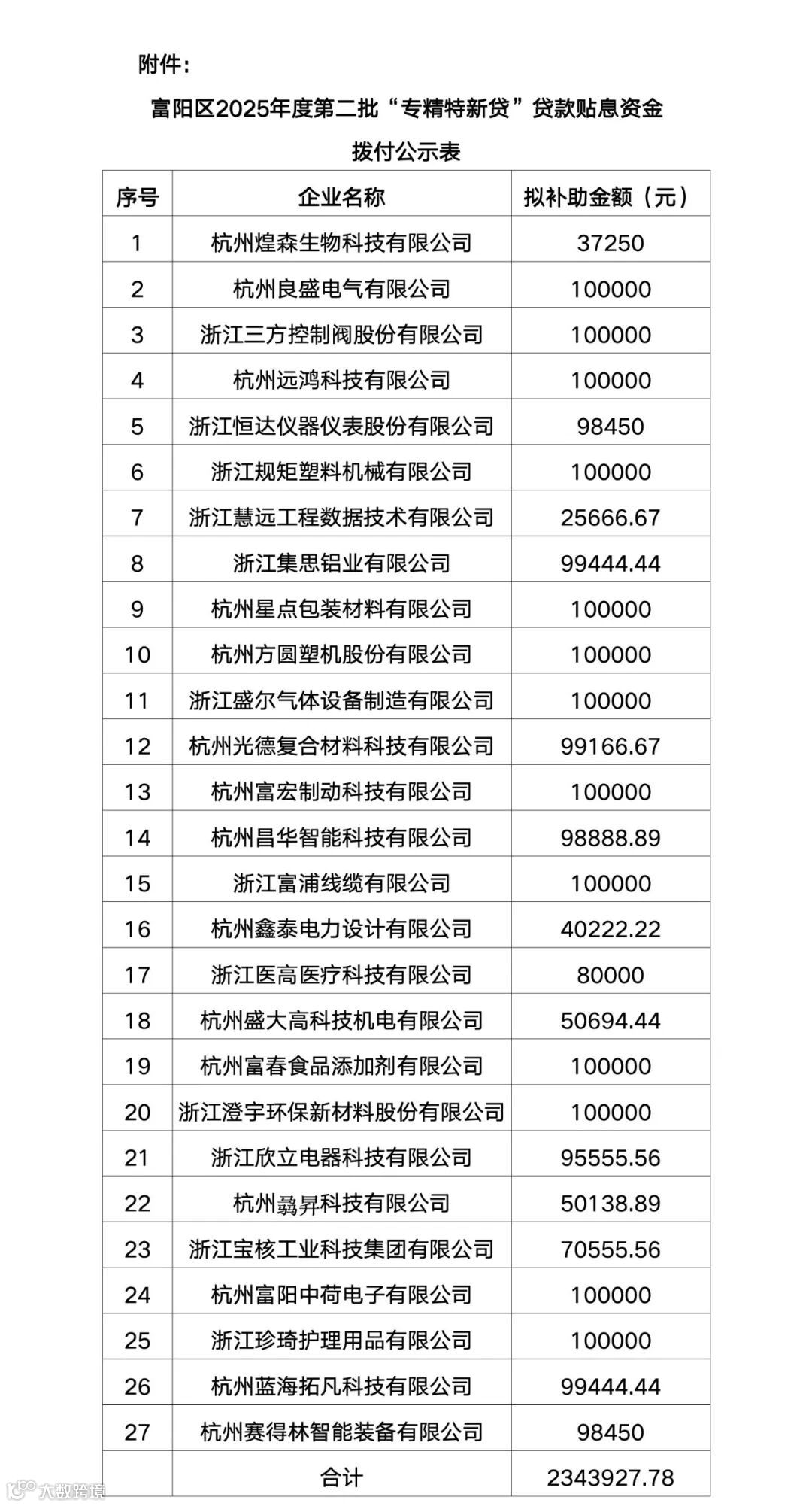 附件:富阳区2025年度第二批“专精特新贷”贷款贴息资金拨付公示表