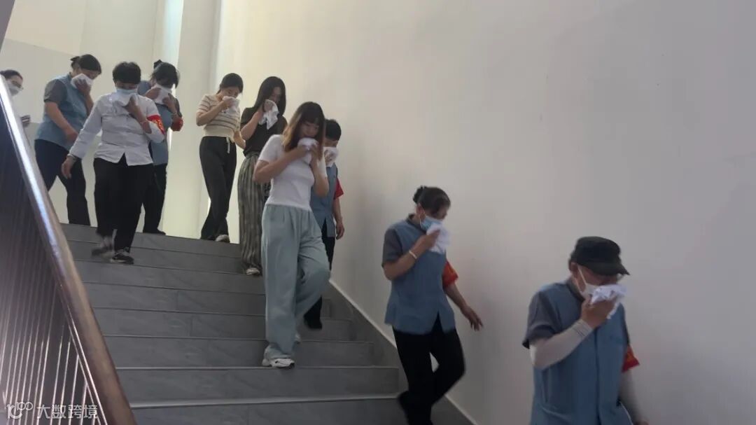 模拟由于火势较大,短时间内无法完全控制,疏散组立即赶赴现场,组织大厦内的人员从最近的安全出口,有序撤离到大楼前安全区域。