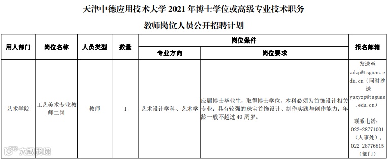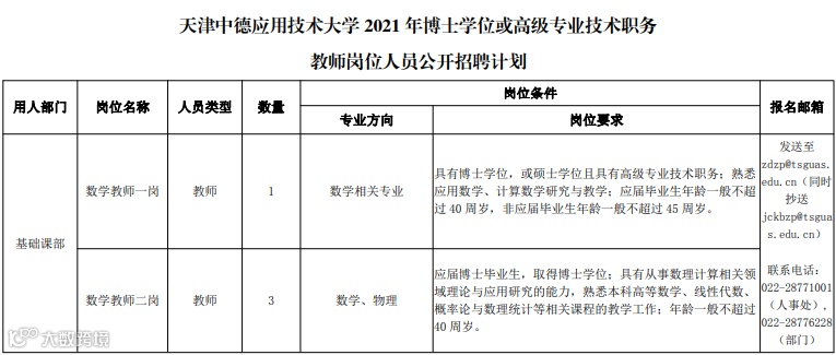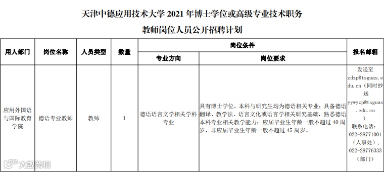 具体招聘岗位见《天津中德应用技术大学2021年博士学位或高级专业技术职务教师岗位人员公开招聘计划》。