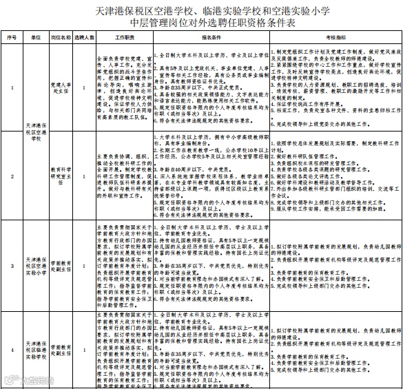 天津港保税区是天津滨海新区的重要经济功能区之一。目前,天津港保税区管理天津港保税区空港学校、天津港保税区空港实验小学、天津港保税区临港实验学校三所中小学校,辖区在校师生四千余人,涵盖小学、初中教育和公办幼儿园管理职能。根据保税区教育教学需求,现面向社会公开选聘学校中层管理人员4名,公告如下: