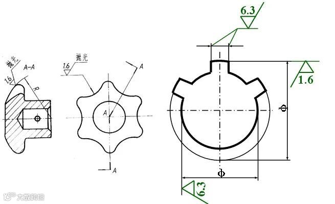 4、零件上连续表面和重复要素(孔、槽、齿等)的表面,其表面粗糙度的符号、代号只标注一次。