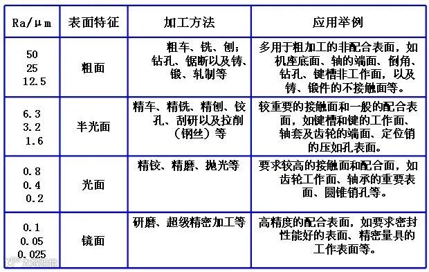 由表Ra值与常用加工方法的对应关系中可见,Ra值越大,加工表面越粗糙;Ra值越小,加工表面越光滑平整。