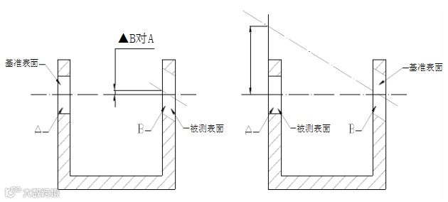 在平台上用V型块全面保持基准平面,用杠杆百分表测量测量面的全表面,在A点调零,确认到B点。