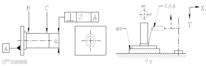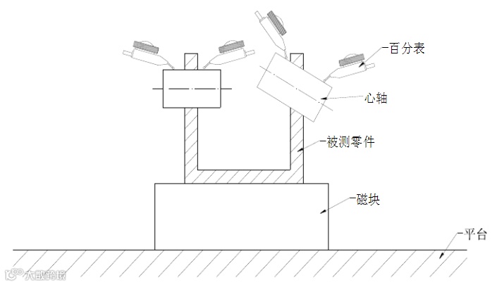 测量时,首先将被测零件固定在平台上,分别在A、B两孔被测轴心线全长进行测量。被测轴心线到公共轴心线的最大读数差,就是同轴度误差。