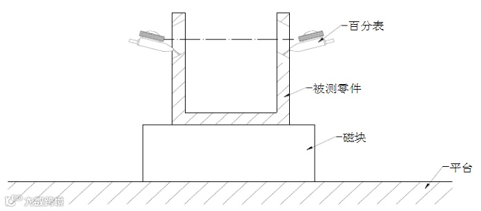 在平台上,使用磁铁支撑基准面整体,测定两个孔到基准面的尺寸,将该尺寸差作平行度。