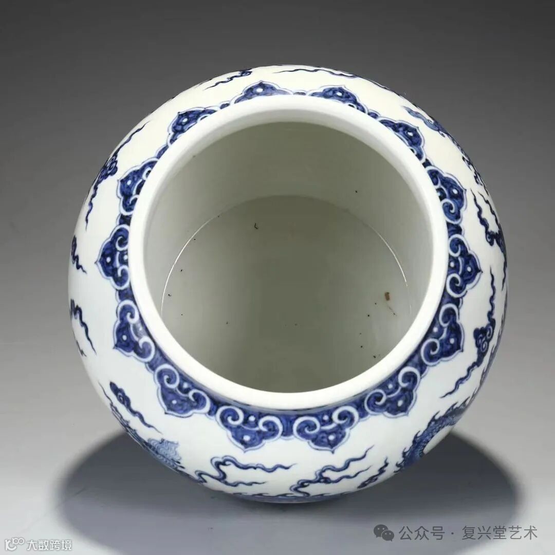 从历史价值来看,明宣德青花龙纹大罐不仅是一件精美的艺术品,更是明代政治、经济和文化的重要见证。宣德皇帝朱瞻基爱好艺术,其在位期间(1426-1435年)大力推动瓷器制作等艺术发展,青花瓷成为当时瓷器中的代表作,使得宣德年间瓷器制作达到鼎盛。此大罐作为宫廷御用瓷器,体现了当时制瓷的最高水平,也反映了明代皇室对瓷器艺术的追求 。其云龙纹象征皇权与吉祥,体现了当时严格的等级制度和皇家的独尊地位。宣德瓷器常被用作宫廷御用器物,象征着皇权的威严和国家的富强。例如,宣德皇帝曾将带有五爪龙纹的瓷器赏赐给藩王和外国使节,以示国力强盛。