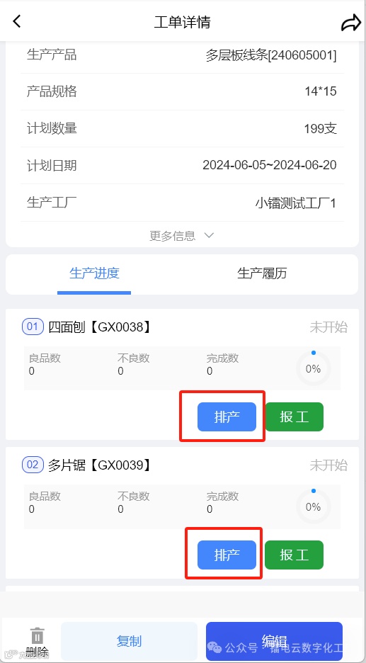 首先,在工单管理详情页,点击蓝色的按钮,将生产工艺的每一道工序排产发布,发布后相关生产人员就能接收到任务;