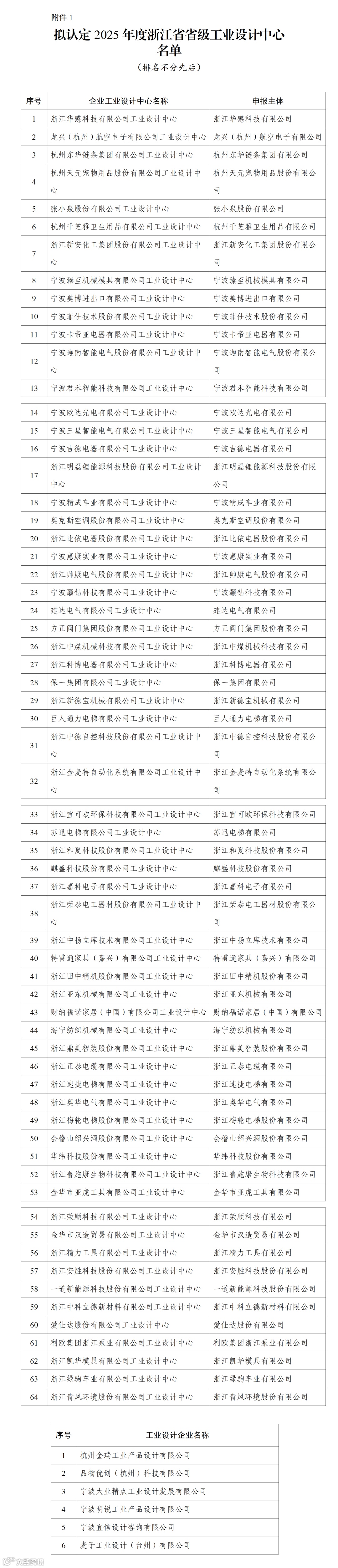 根据《浙江省省级工业设计中心认定管理办法》(浙经信服务〔2024〕62号)和《浙江省经济和信息化厅关于组织开展2025年度省级工业设计中心认定和复核的通知》(浙经信软服便函〔2025〕57号),经企业自主申报,各地经信部门初审,省经信厅组织专家评审、信用审查,并委托各设区市经信局对2021年(含当年)及以前认定的省级工业设计中心开展复核,拟认定浙江华感科技有限公司工业设计中心等70家单位为2025年度省级工业设计中心(第九批),拟通过杭州钱江制冷压缩机集团有限公司工业设计中心等283家单位省级工业设计中心的复核,现予公示。公示期间如有异议,可向省经信厅反映。
