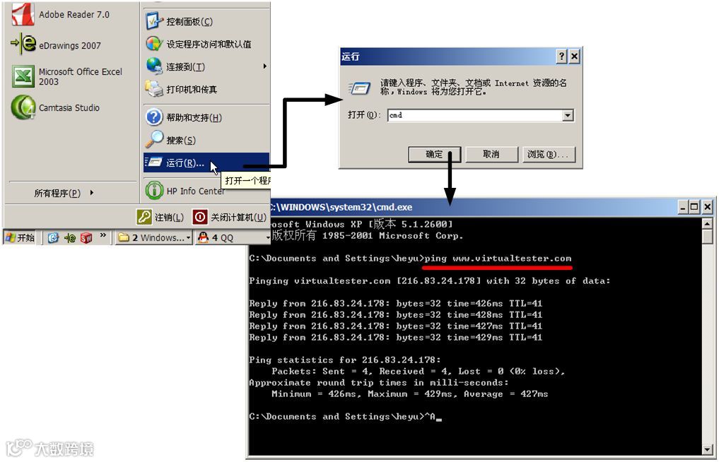如下图所示,选择开始-运行,在运行对话框中输入cmd进入命令行窗口。在其中输入:ping solidworks.virtualtester.com