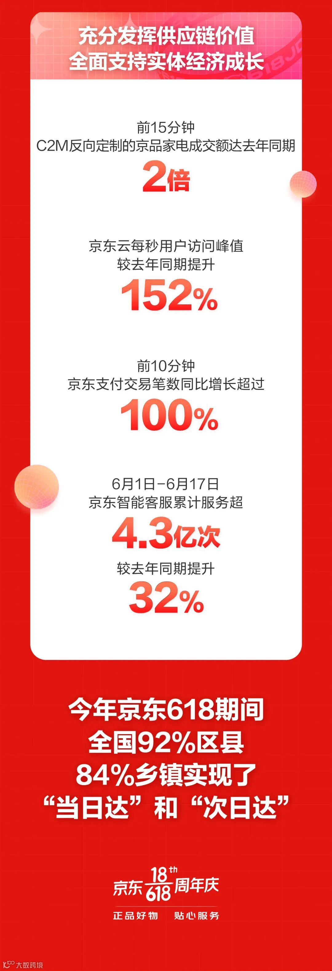 京东金融增长强劲,开场10分钟,京东支付交易笔数同比增长超过100%,618期间,基金日均申购金额同比增长147%、保险日均交易额同比增长166%。京东智能客服提供7*24小时全天候服务,截止17日,京东智能客服累计服务超4.3亿次,较去年同期提升32%。