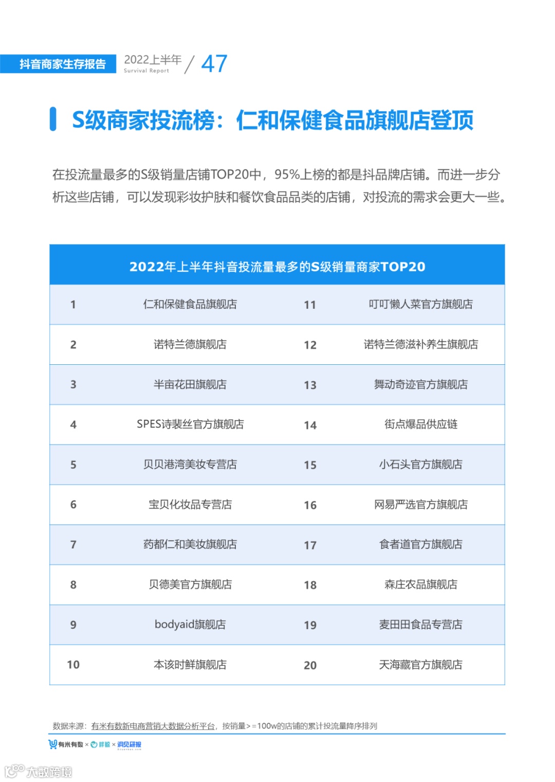 报告从销量、投流量两大维度分析头部商家的竞争状况,在TOP20的S级销量店铺中,